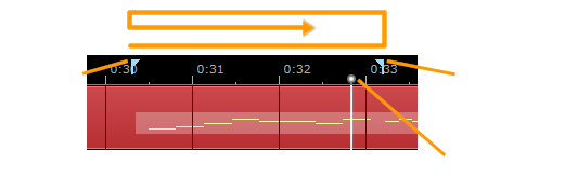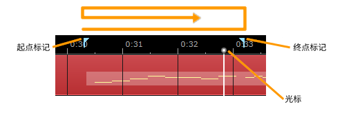 在标尺栏上拖动(按下鼠标左键)起点 / 终点标记可以调整它们的位置。如果在拖动的同时按住 Alt 键,则标记会自动吸附到最接近的秒(或小节,取决于标尺栏的时间基准)上。