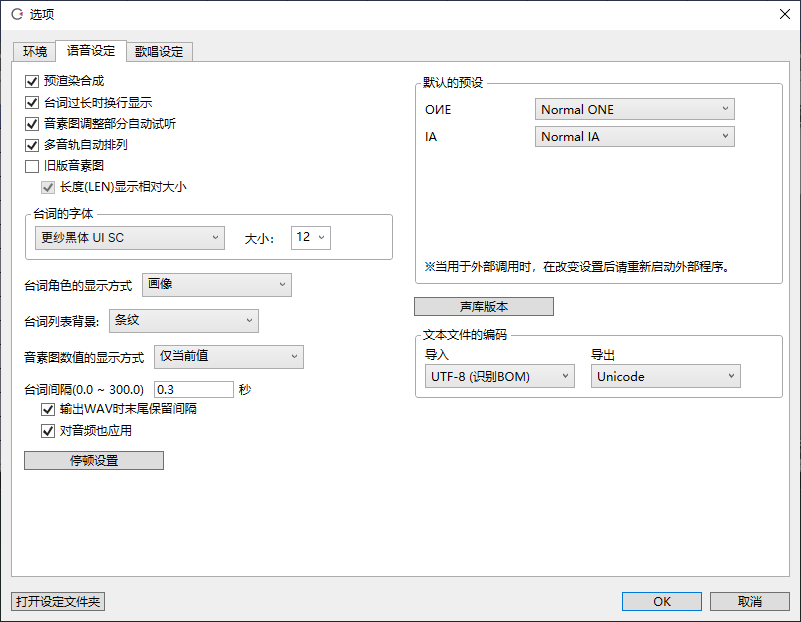 在 SAPI5 中,「语速」由链接方的设置决定,「音量」和「音高」由链接方和本软件的设置共同决定,其他设置由本软件决定。如果连接到 SAPI5 时声音很小,请试着将预设的音量调到 +8.00 / 100。