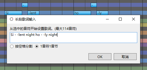 选择「1音符1音节」时,由半角空格分割的单词会自动再按音节分割,并为每个音符分配一个音节。