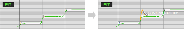 在音高调整界面内,当叠加显示颤音的振幅或周期时,颤音影响后的音高也会一同显示。