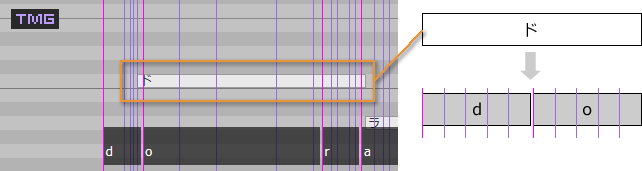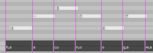从本质上讲,时间由歌词中每个音素(例如「ド」的「d」或「o」)的五条线组成,一条红紫色的音素线表示该音素的开始,四条浅紫色的状态线表示该音素的声音变化。