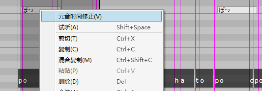 选择音符(或在 TMG 调整界面选择范围)后,从右键菜单中选择「元音时间修正」,可以将元音的发声时间自动调整到音符的起始处。