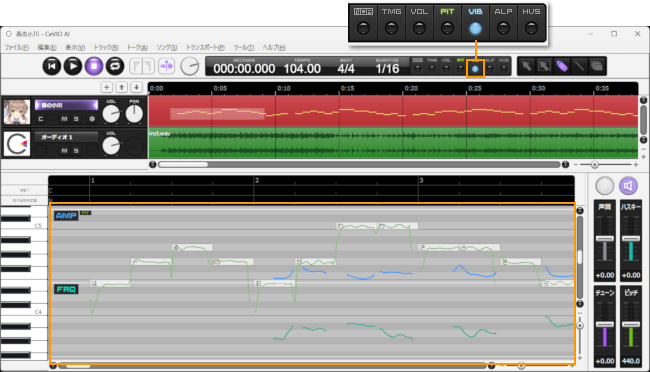 在这里调整声音的颤音。在钢琴卷帘的上半部分调整振幅(AMP),下半部分调整周期(FRQ)。