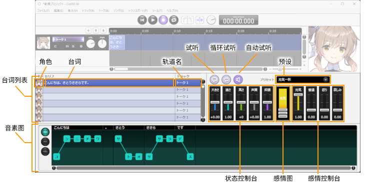 在左边的台词列表中输入文字,在右边的状态与感情控制台以及音素图中进行调整。