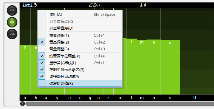 选择音素图右键的「恢复初始值」,可以将重音、音高、音长和音量恢复到调整前的状态。