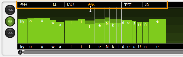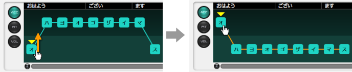 从上方的文字区域开始上下拖动,可以以单语单位调整音高 / 音量。