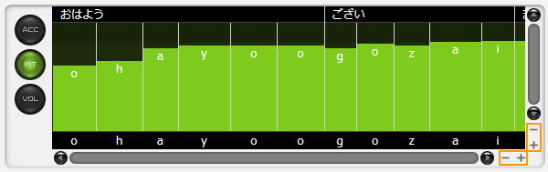 在 PIT 和 VOL 屏幕上,音素图右下方的 [+] 和 [-] 按钮可以用来放大和缩小显示。