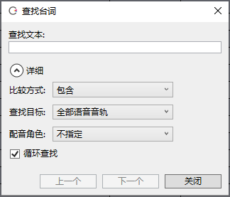 「语音」菜单的「搜索」、台词列表右键菜单的「搜索」以及快捷键 Ctrl+F 都可以调出搜索窗口。