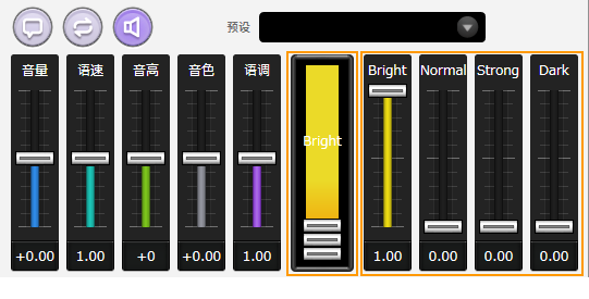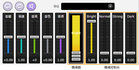通过拖动 Bright 或 Angry(※)等推子,可以以所需的比例混合多种感情。