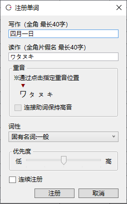例如,如果注册了「四月一日(ワタヌキ)」,但又注册了优先度更高的「一日(ツイタチ)」,则「四月一日」就会念成「シガツツイタチ」。