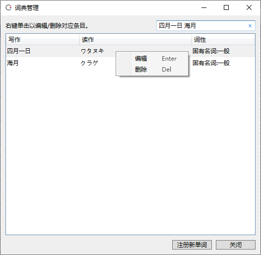 Del 键可以删除选中的单词,Enter 键可以编辑选中的单词。